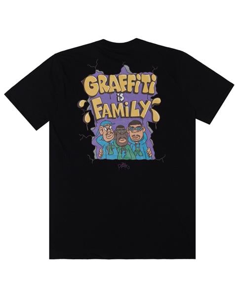 Na parte frontal, a camiseta traz o logo Fire Apparel combinado com o traço característico da Poisé, criando um visual minimalista e estiloso. Já nas costas, a arte exclusiva com a frase "Graffiti Is Family" e os personagens cartoonizados garantem impacto visual e identidade, reforçando que o verdadeiro corre das ruas é feito em união.