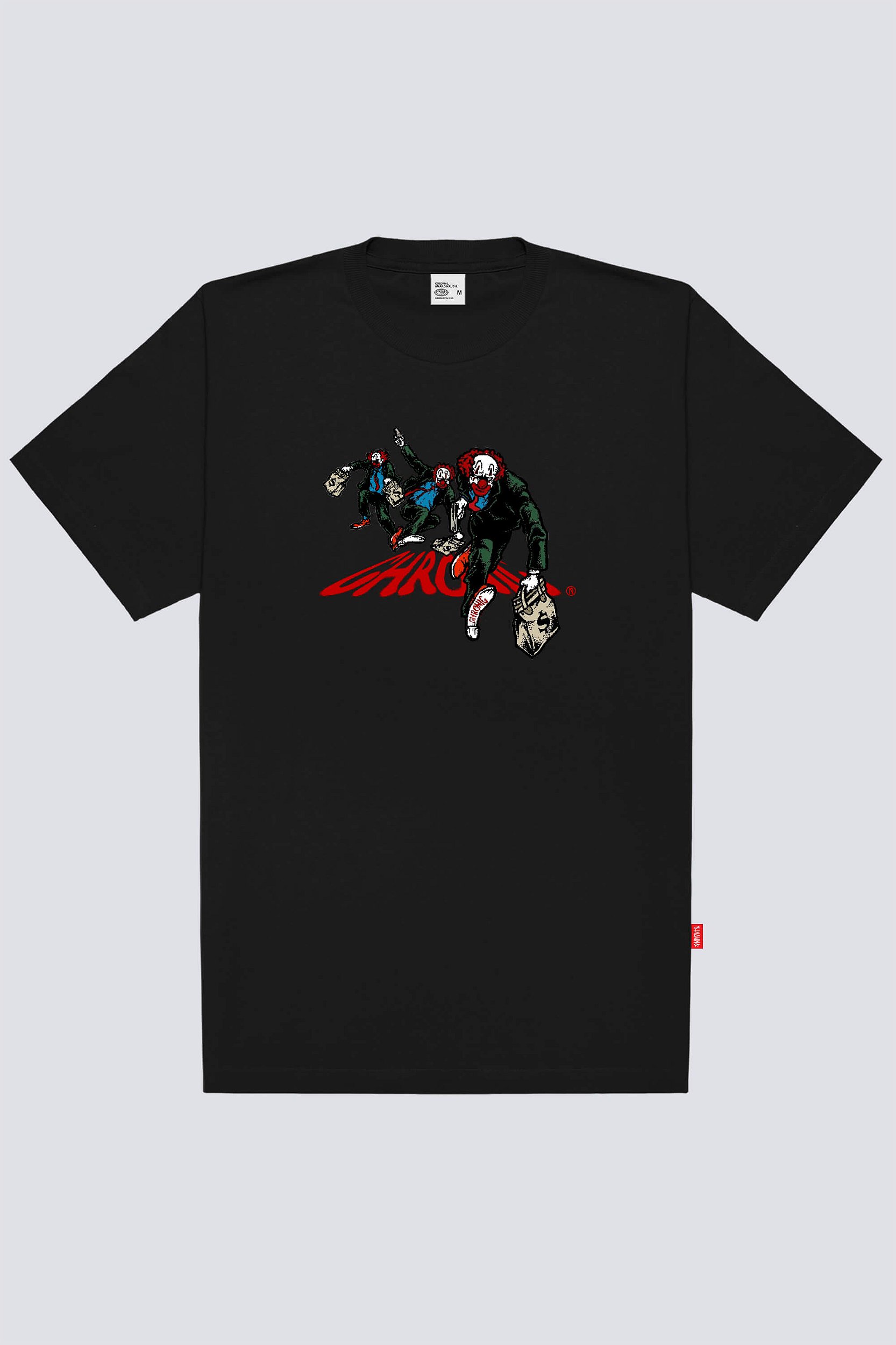 Na frente, o destaque fica para o trio de palhaços mascarados em movimento, estampado com traços fortes e cores vibrantes, passando a sensação de ação e corre — símbolo do estilo ousado da marca.