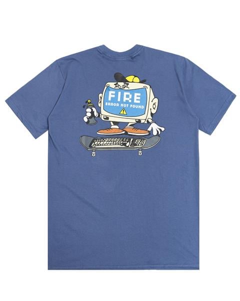 Nas costas, a arte ganha vida com um personagem computador vintage sobre um skate, segurando uma latinha de spray enquanto exibe na tela o alerta de erro. Uma mistura de nostalgia, cultura urbana e referências digitais que só a Fire consegue traduzir assim.