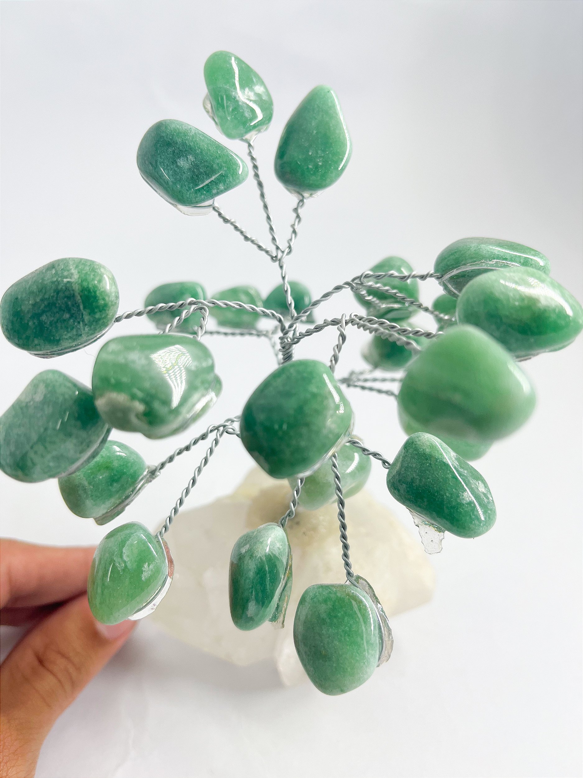 A Árvore da Prosperidade é uma peça esotérica que une beleza, energia positiva e simbolismo espiritual. Suas folhas são feitas de Aventurina Verde, pedra reconhecida por atrair sorte, oportunidades e crescimento, enquanto sua base é formada por Quartzo Branco, um cristal de purificação e equilíbrio.