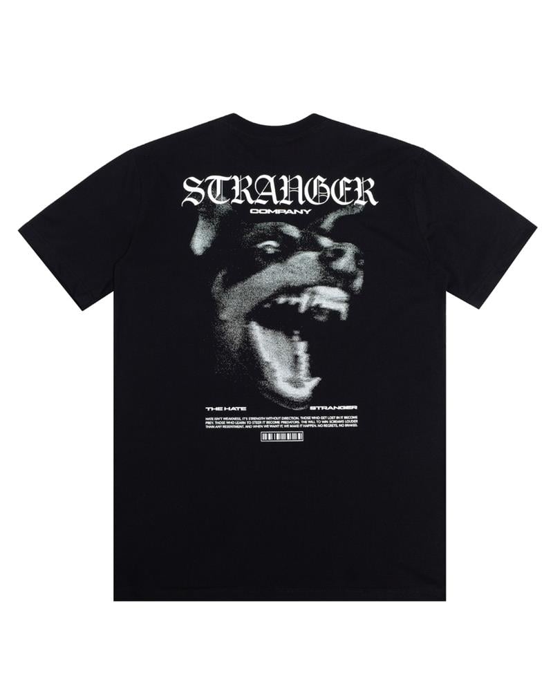 O destaque fica para a estampa traseira em alta definição, com visual granulado e atmosfera agressiva, reforçada pela tipografia gótica da Stranger. Na parte frontal, o logo aplicado em silk branco garante identidade sem exageros.