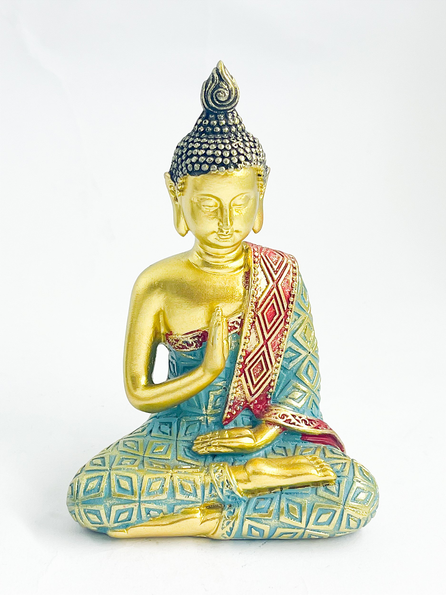 O Buda está representado em posição de meditação, com um manto ricamente trabalhado em tons de azul e vermelho com detalhes geométricos, que realçam a peça e dão um toque sofisticado à decoração. O rosto sereno e a postura tranquila simbolizam proteção espiritual, introspecção e iluminação.