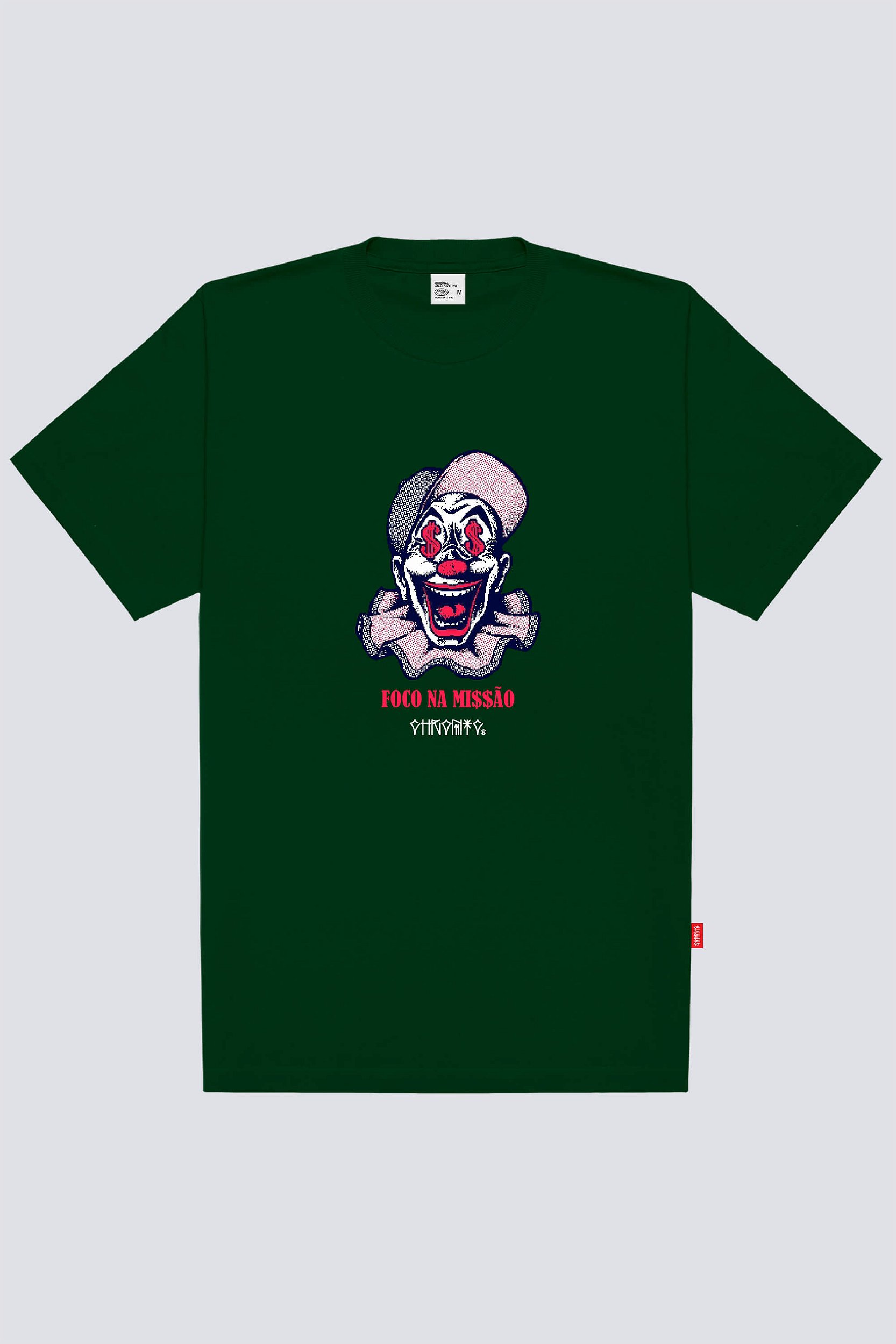 No peito, o palhaço ilustrado em alto contraste traz expressão marcante e detalhes que chamam atenção de longe, acompanhado da frase “Foco na Missão”, reforçando a identidade ousada e irreverente da marca.